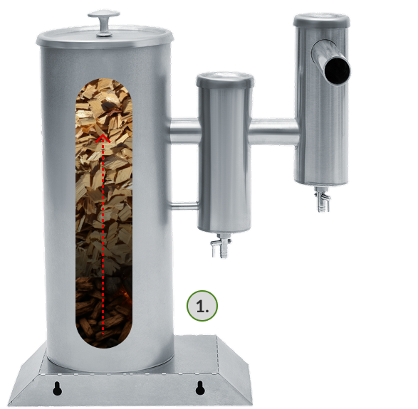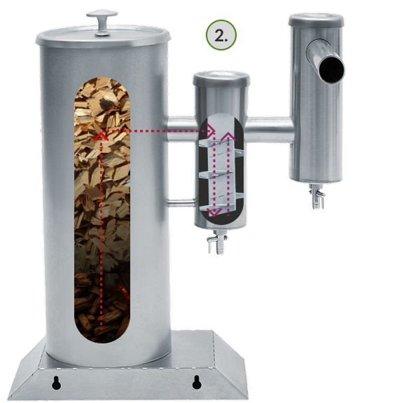 Ответ: В очаг по мере сгорания поступает новая щепа. Дым от тления проходит по трубам, где охлаждается и очищается от примесей. Потом он поступает в коптильную камеру и обрабатывает продукты.
